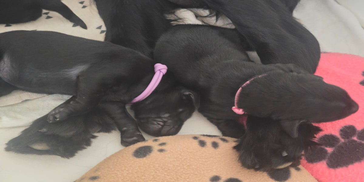 Het zijn heerlijk tevreden pupjes, ze drinken goed, ze poepen goed en ze slapen heerlijk zoet! Oh en ieder pupje heeft twee bandjes, alleen is het tweede lila bandje helaas stuk gegaan, soms zal zij op de foto's dan ook een zwart bandje dragen.